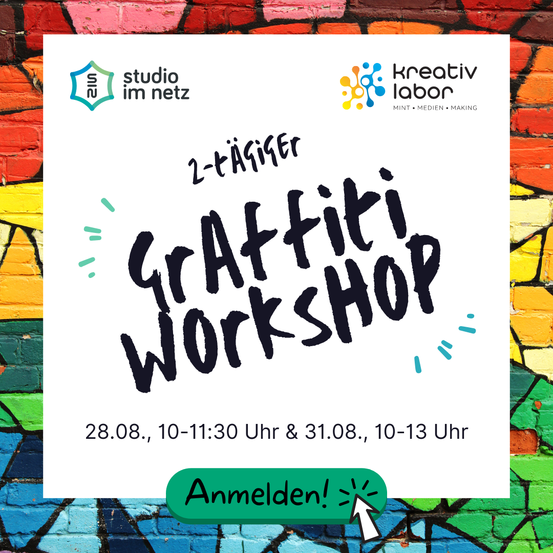 Der Graffiti-Workshop findet an zwei Tagen statt: Am ersten Tag werden wir gemeinsam Ideen für das Graffiti sammeln und Skizzen rund um die Themen Naturwissenschaften/ Experimente und Medien anfertigen. Am zweiten Tag sprayen wir unsere Motive auf eine große Leinwand. Das fertige Kunstwerk wird auf der offiziellen Eröffnungsfeier des Kreativlabors (am 15. September) präsentiert und dauerhaft im Eingang aufgehängt.